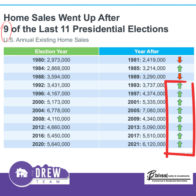 Short term we will see less transactions as many people want to see what happens with the election first. However, in 9 of the last 11 years following the elections the number of transactions has increased. More buyer traffic and prices also rose.