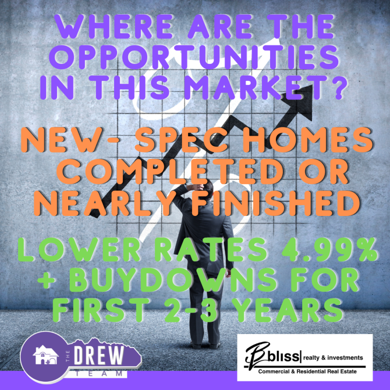 The FIRST opportunity is that more properties are available as new built spec homes. This means not having to wait 9-12 months for them to be built, but instead typically there are many options just a few months from completion AND we have been successful closing a home recently that the builder gave a rate of 4.99% PLUS they included a buydown rate that was even lower the first 3 years.